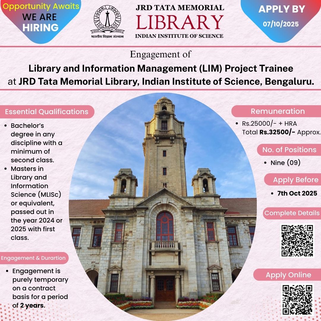 Dear Professionals Greetings! Please bring the following announcement to the notice of interested candidates. Indian Institute of Science <https://iisc.ac.in/> (IISc), Bengaluru, invites applications for *09 positions* of LIM Project Trainee in the JRD Tata Memorial Library <https://library.iisc.ac.in/> (JRDTML) at the Institute. *Essential Qualifications:* Bachelor’s degree in any discipline with a minimum of second class and Master's in Library and Information Science (MLISc) or equivalent, passed out in the year 2024 or 2025 with first class. *Nature of Traineeship:* Learn and develop professional skill sets while you work on different functions and services of the library using emerging tools and technologies. *Duration:* Engagement is purely temporary on a contract basis for a period of *2 years.* *Remuneration:* Rs. 25,000/- + HRA (*Gross Amount Rs.32,500/-* *Approximately*) per month. *Selected Project Trainees are expected to work 6 days a week on any of the three shifts, including night shift duties and public holiday duties on a rotation basis.* *For complete details about this announcement, please visit*: https://iisc.ac.in/wp-content/uploads/2025/09/2.-Advertisement-1.pdf *For submission of the online form, please visit*: https://recruitment.iisc.ac.in/Temporary_Positions/ *Deadline for submitting applications:* 7th October, 2025. [image: forum-2.jpg] Best Regards Umesh --- Umeshareddy Kacherki Ph.D Librarian, Indian Institute of Science Bengaluru - 560012, Karnataka, India.